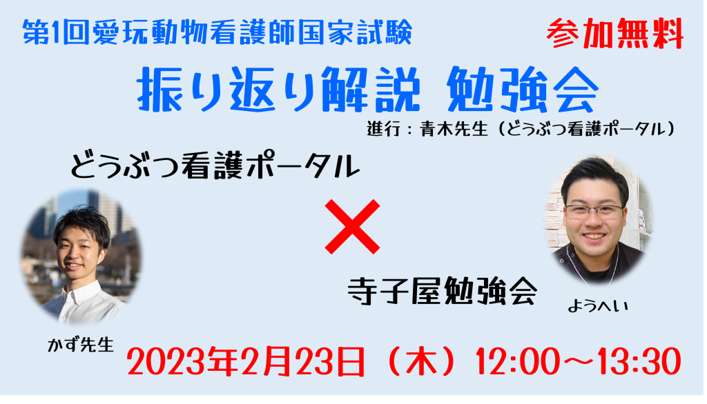 内容:第1回愛玩動物看護師国家試験の一般・実地・必須について答えにたどり着くために必要な知識の解説。「私たちはこう考えた」という内容について解説します。肩の力を抜いて気軽に聞いてみて下さい。